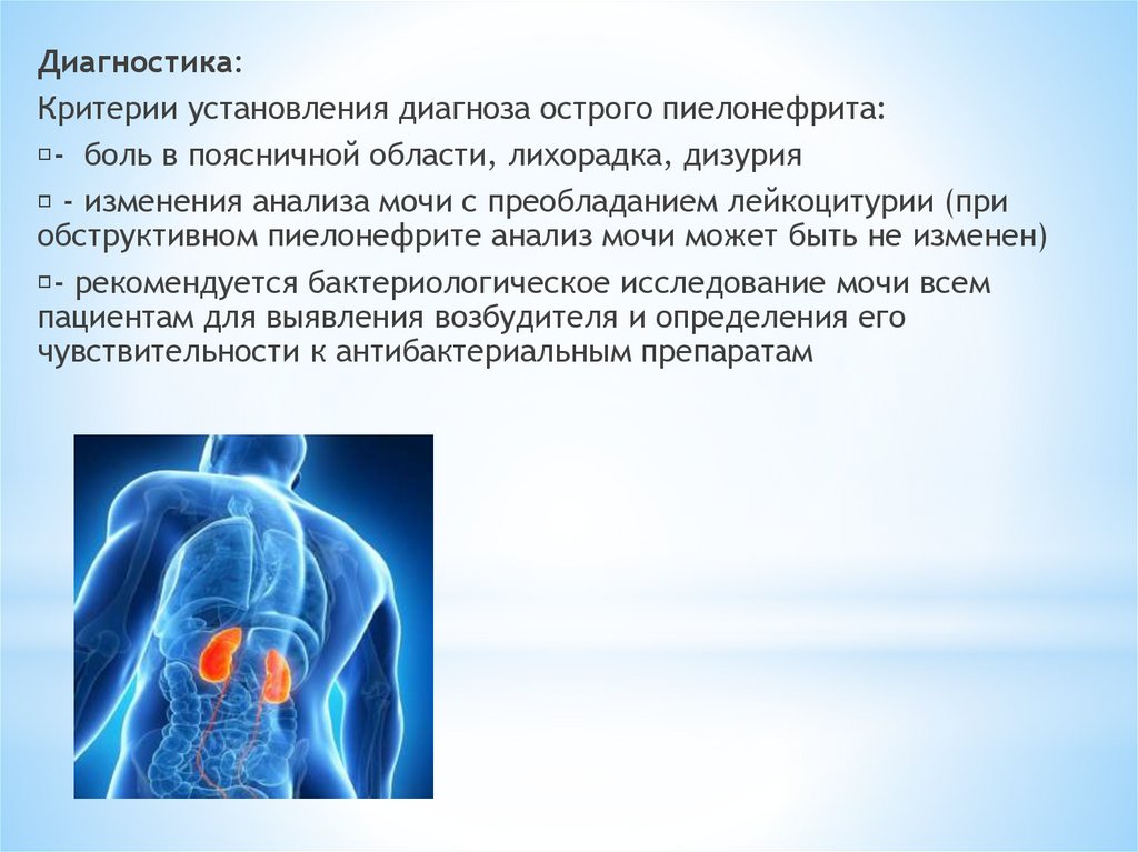 Диагностика:Критерии установления диагноза острого пиелонефрита: