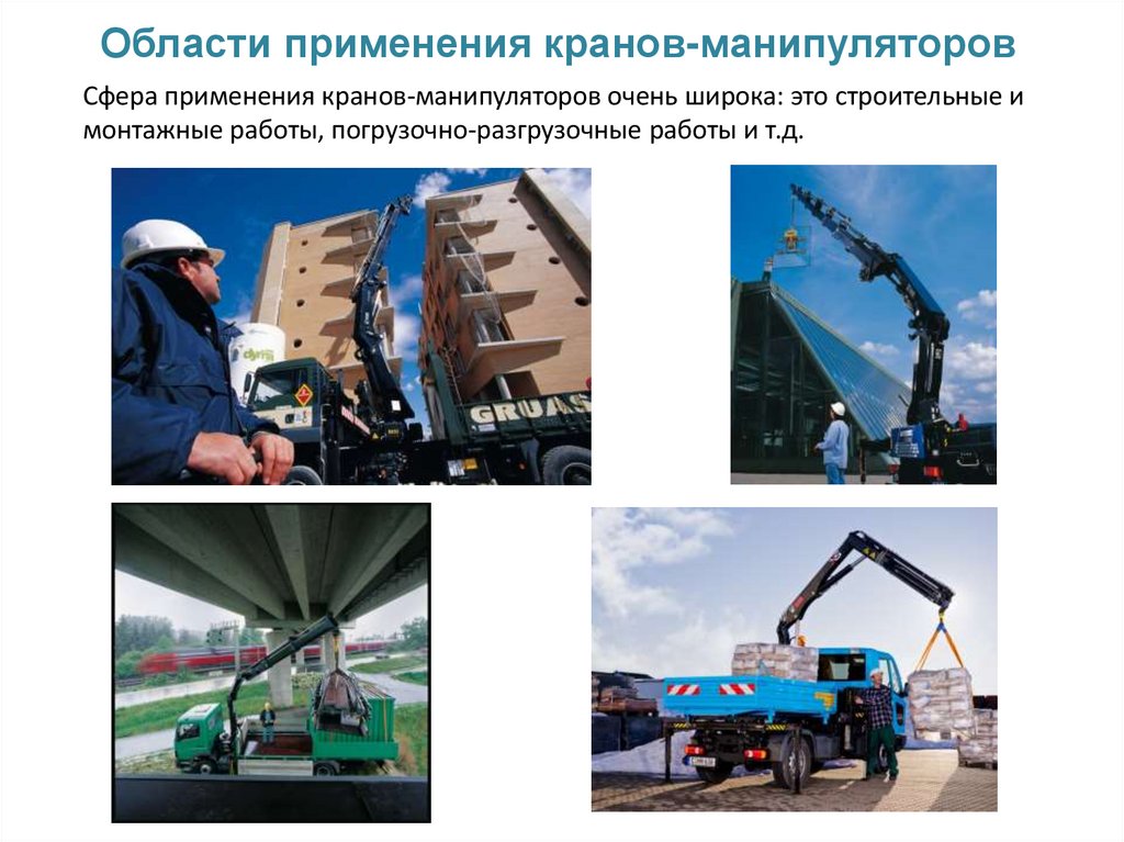 Области применения кранов-манипуляторовСфера применения кранов-манипуляторов очень широка: это строительные и
