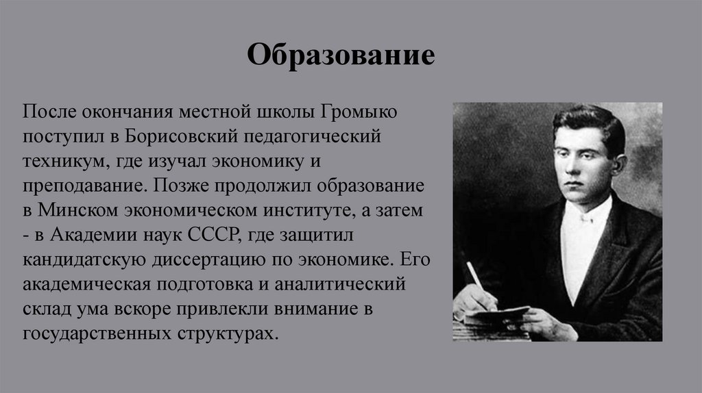 ОбразованиеПосле окончания местной школы Громыко