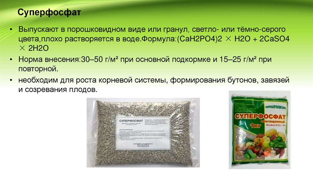 Суперфосфат• Выпускают в порошковидном виде или гранул, светло- или тёмно-серого