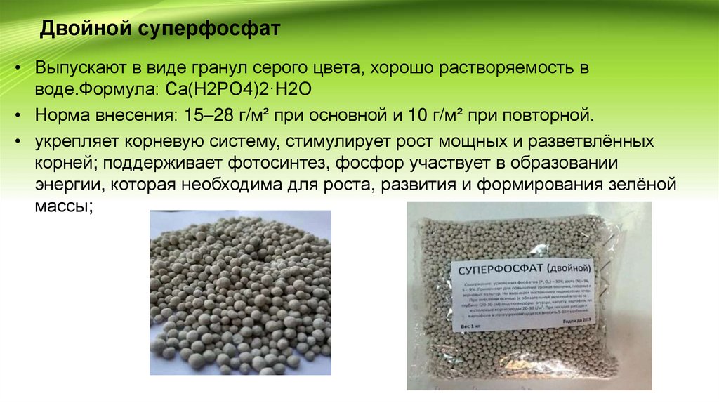 Двойной суперфосфат• Выпускают в виде гранул серого цвета, хорошо растворяемость в