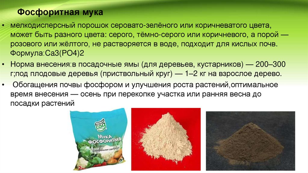 Фосфоритная мука• мелкодисперсный порошок серовато-зелёного или коричневатого цвета,