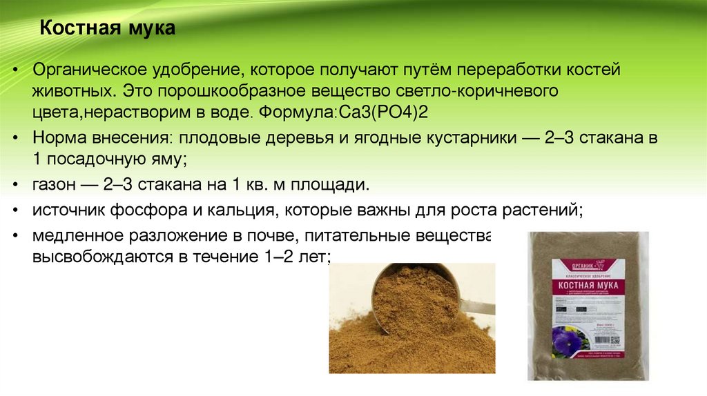 Костная мука• Органическое удобрение, которое получают путём переработки костей
