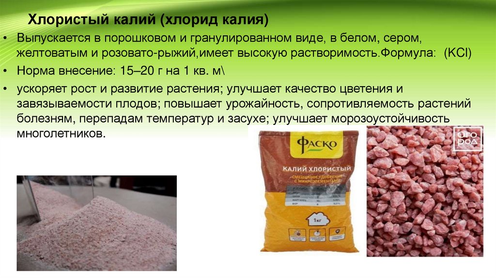 калий (NPK). Выпускается в виде гранул розово-молочного цвета размером
