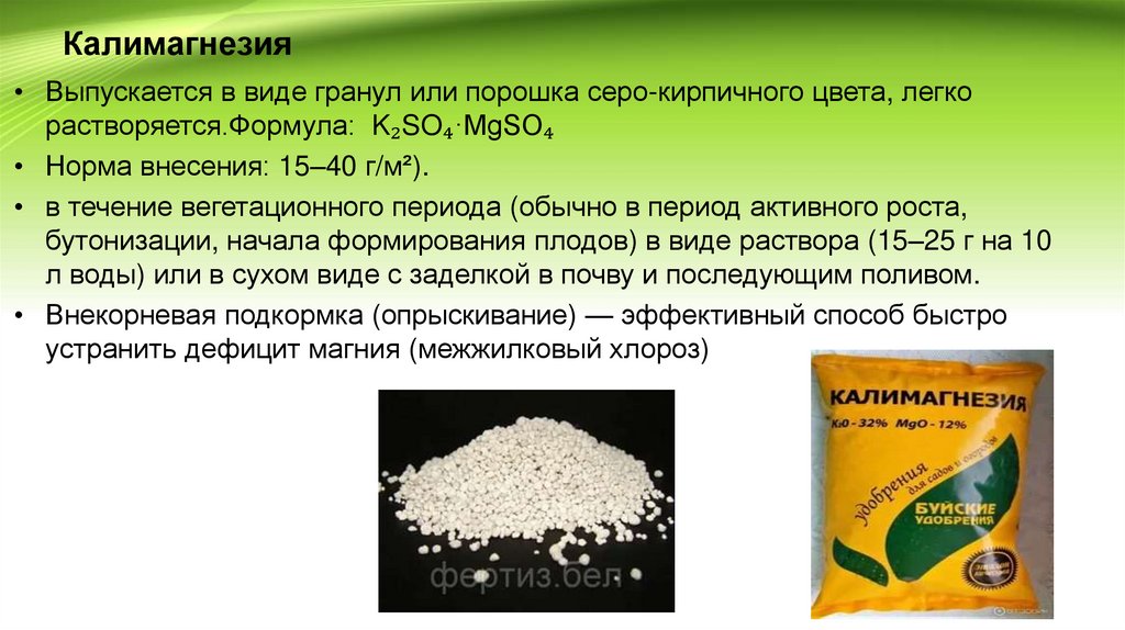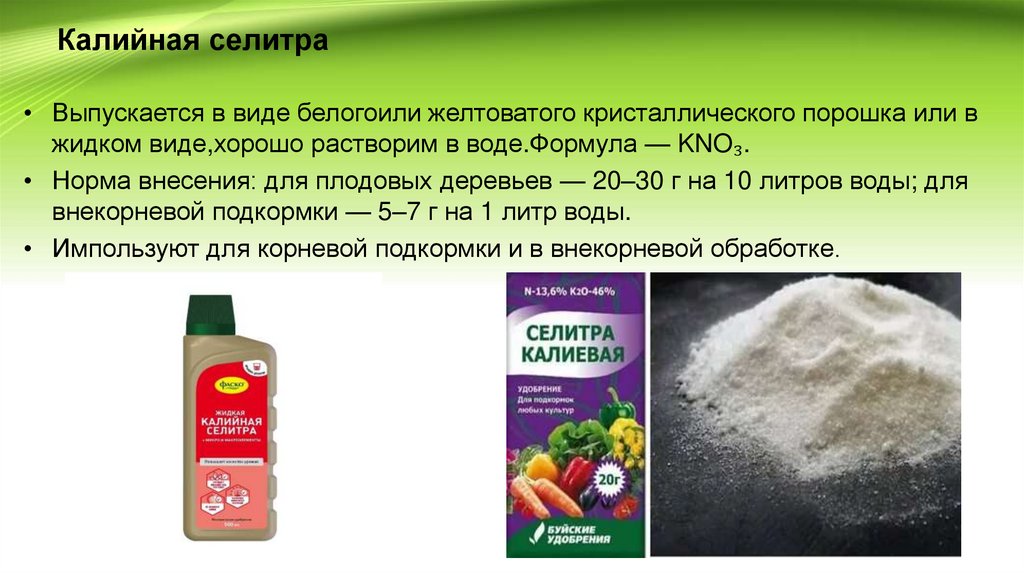 • Вносят для подкормок в период вегетации.