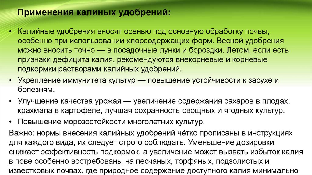 Применения калиных удобрений:• Калийные удобрения вносят осенью под основную обработку почвы,