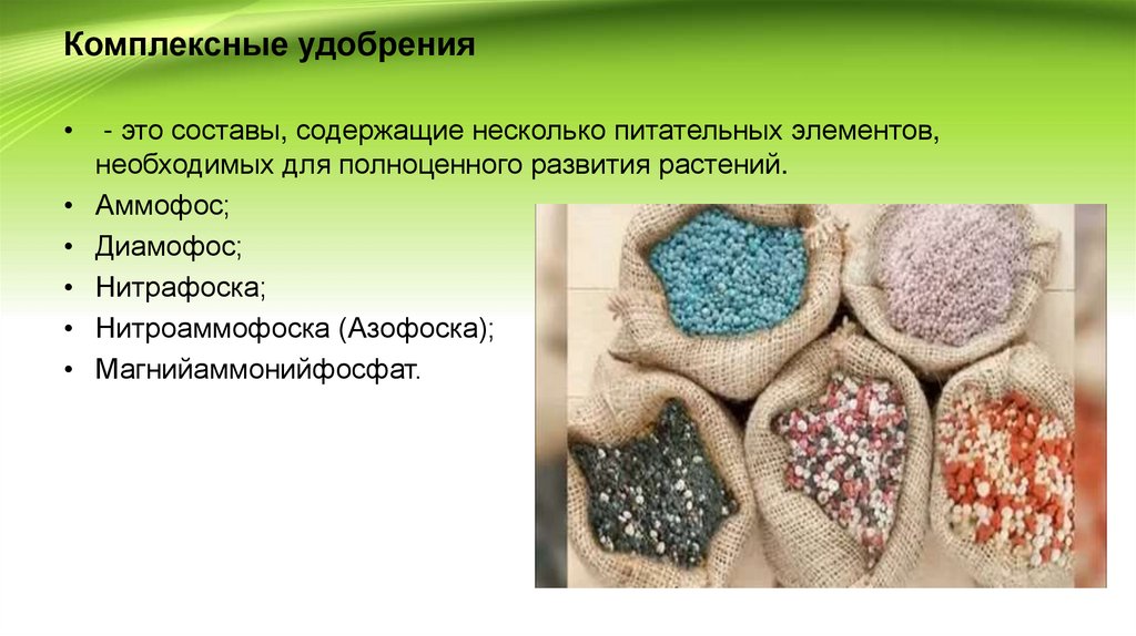 Комплексные удобрения- это составы, содержащие несколько питательных элементов,