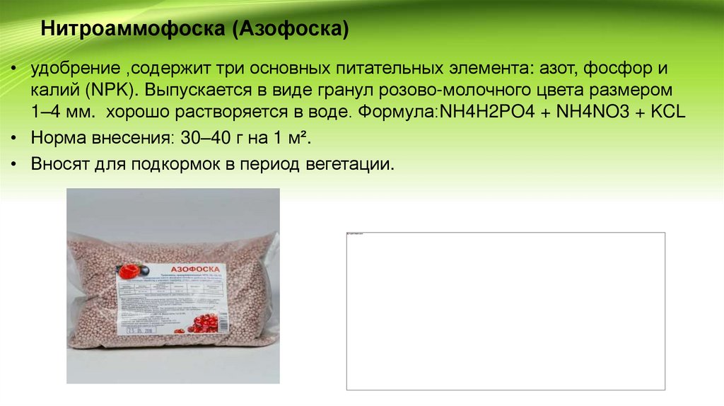Нитроаммофоска (Азофоска)• удобрение ,содержит три основных питательных элемента: азот, фосфор и