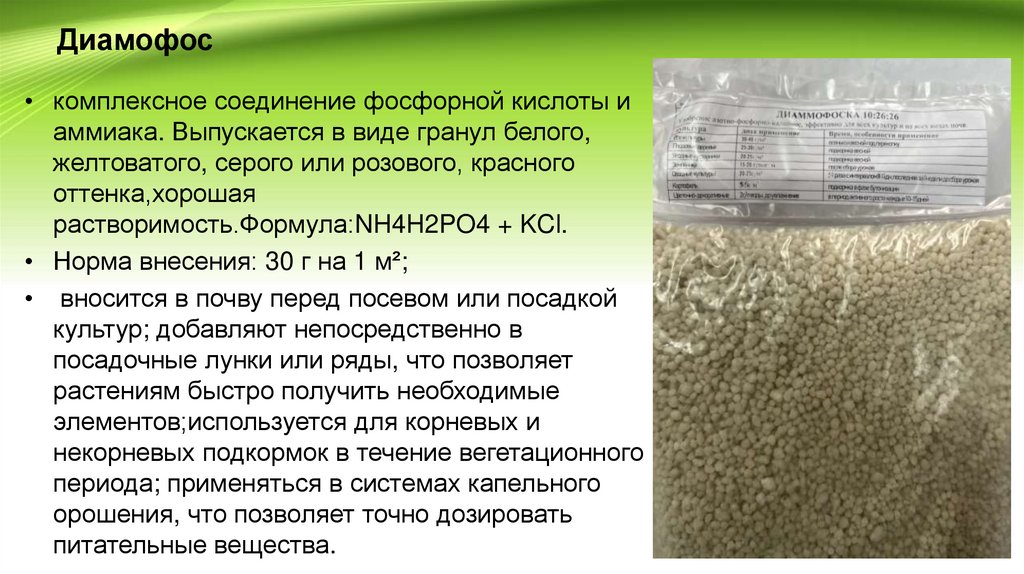 • обеспечивает растения азотом и фосфором; способствует наращиванию