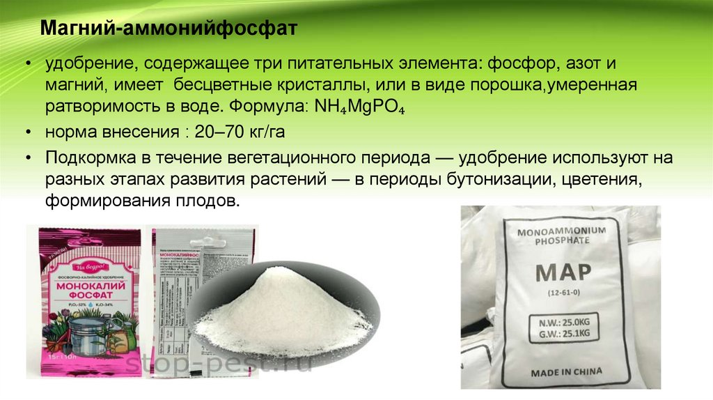 Магний-аммонийфосфат• удобрение, содержащее три питательных элемента: фосфор, азот и