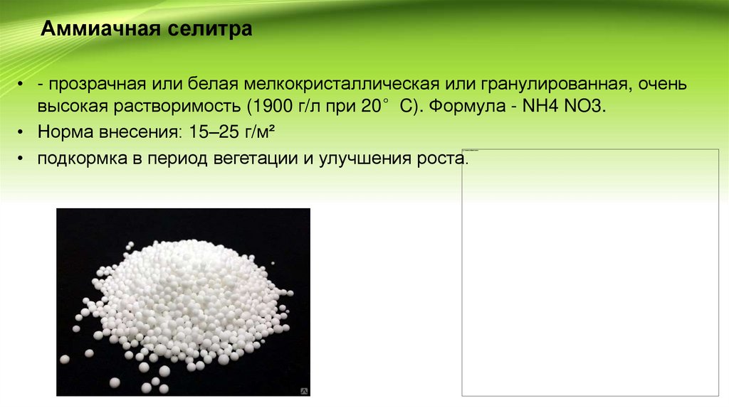 Аммиачная селитра• - прозрачная или белая мелкокристаллическая или гранулированная, очень