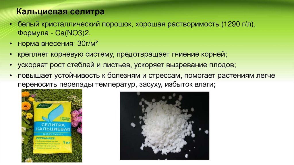 Кальциевая селитра• белый кристаллический порошок, хорошая растворимость (1290 г/л).