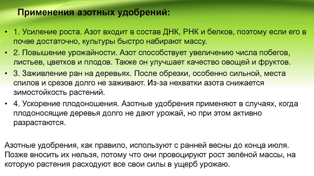 Азотные удобрения, как правило, используют с ранней весны до конца июля.