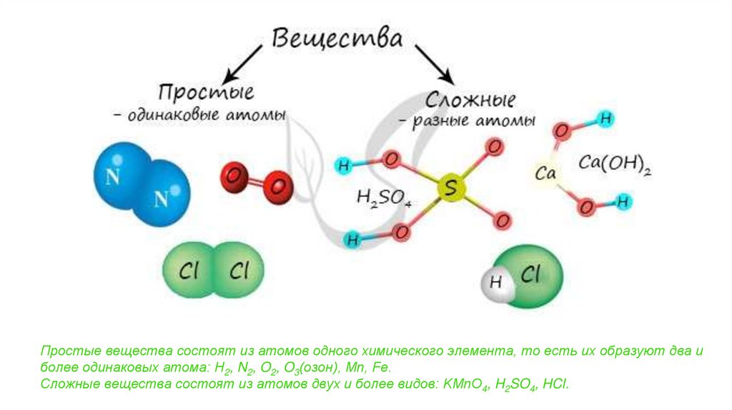Простые вещества состоят из атомов одного химического элемента, то есть их образуют два иболее одинаковых атома: H2, N2, O2, O3(озон), Mn, Fe.