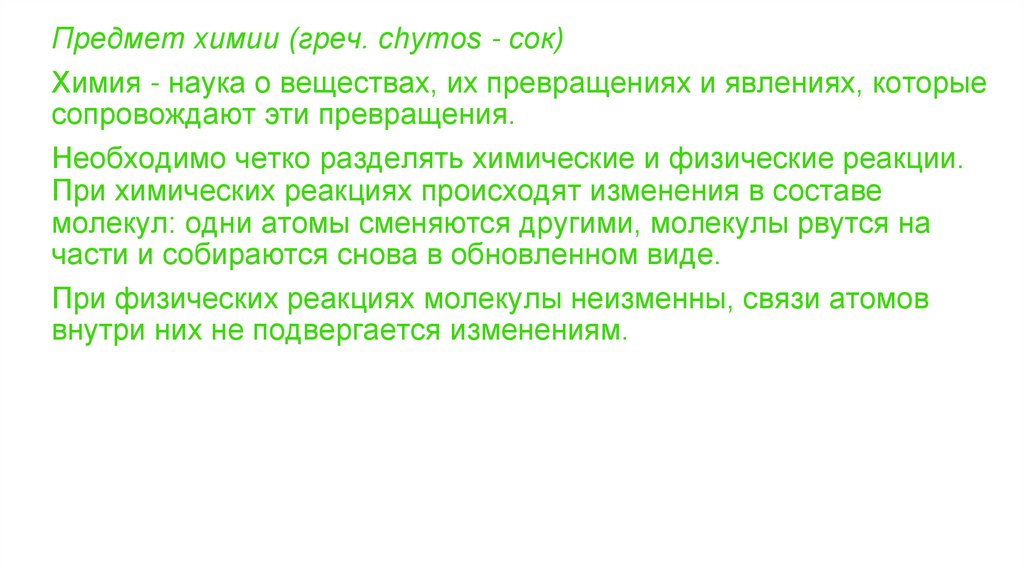 Предмет химии (греч. chymos - сок)Химия - наука о веществах, их превращениях и явлениях, которые