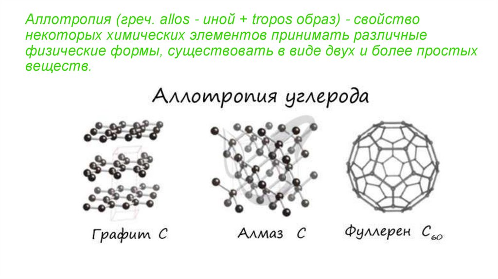 Аллотропия (греч. allos - иной + tropos образ) - свойствонекоторых химических элементов принимать различные