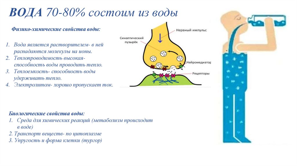 ВОДА 70-80% состоим из водыФизико-химические свойства воды:
