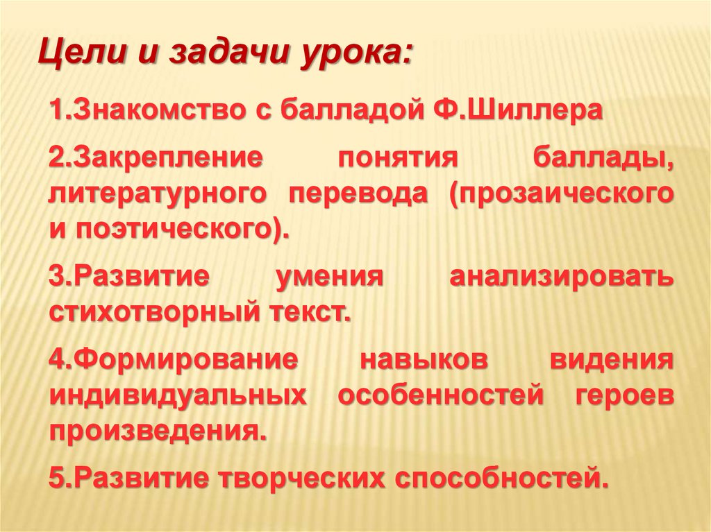Цели и задачи урока:1.Знакомство с балладой Ф.Шиллера