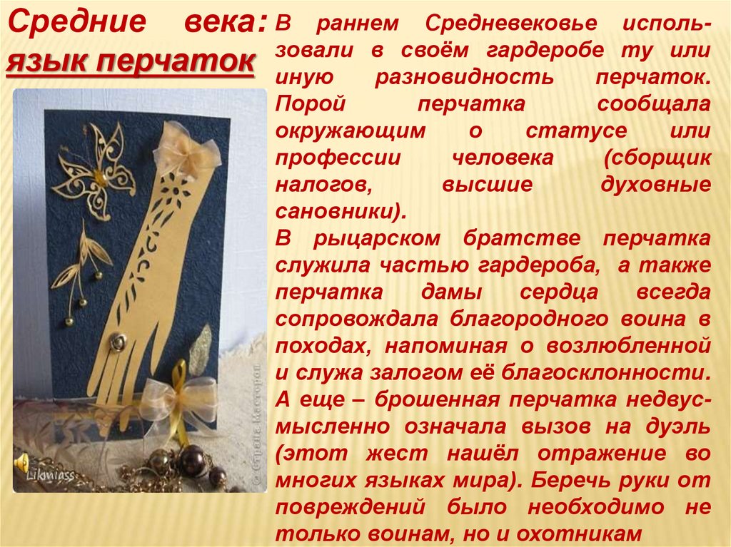 Средние века: В раннем Средневековье испольв своём гардеробе ту илиязык перчаток зовали