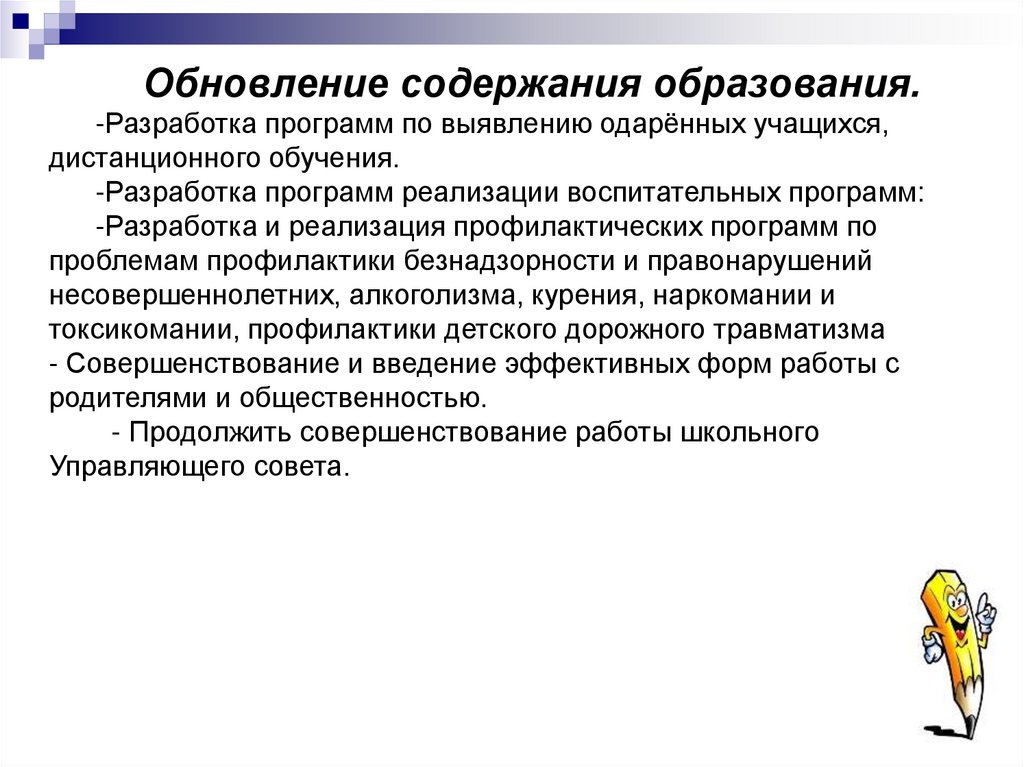 Обновление содержания образования.-Разработка программ по выявлению одарённых учащихся,