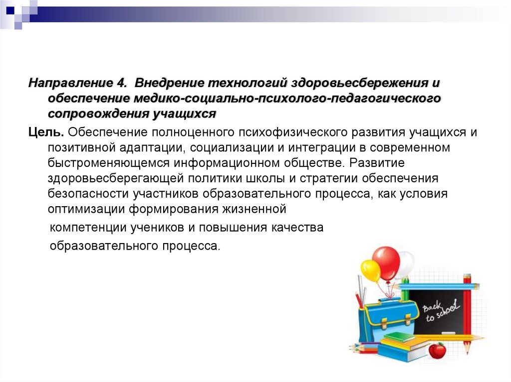 Направление 4. Внедрение технологий здоровьесбережения иобеспечение медико-социально-психолого-педагогического