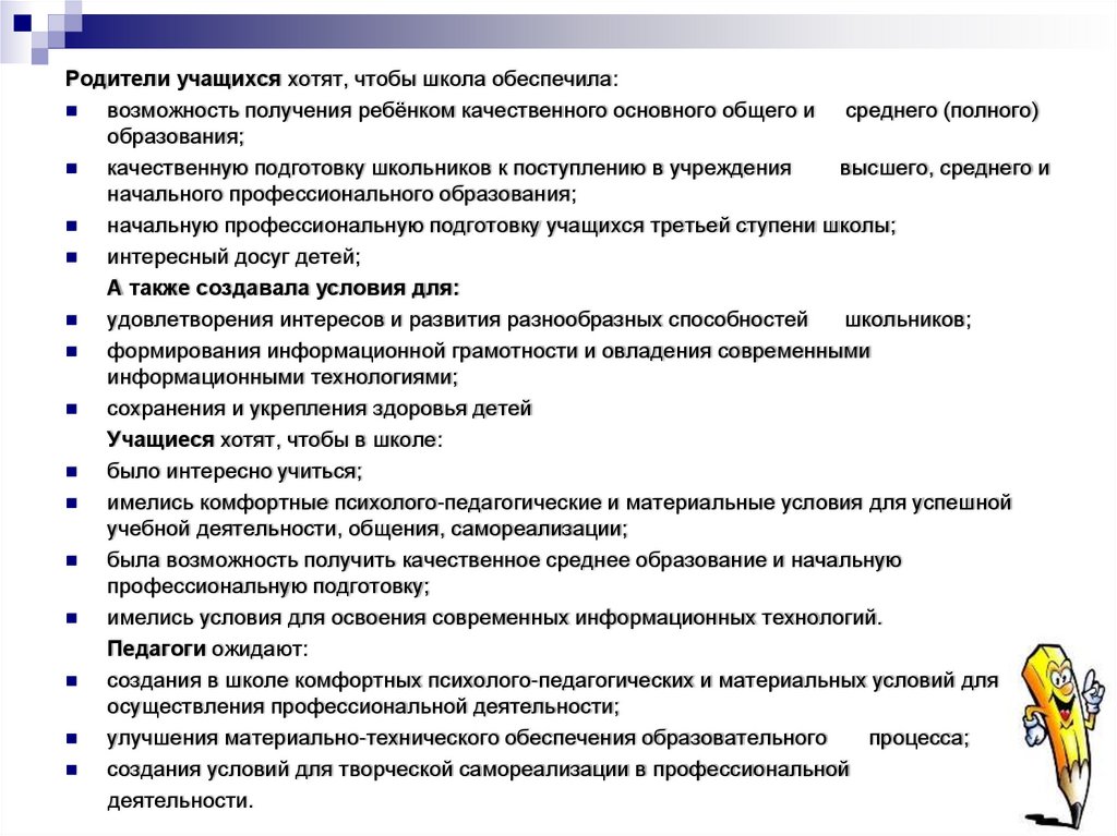 Изучая социальные ожидания по отношению к школе, мы выделили субъекты, участвующие в