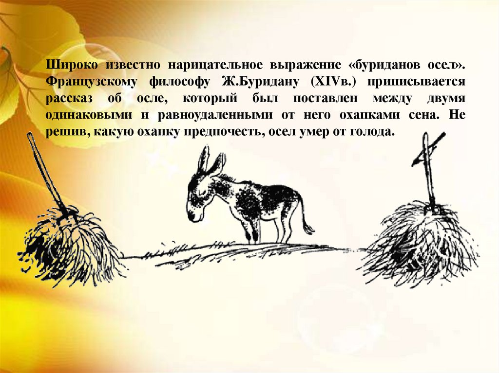 Широко известно нарицательное выражение «буриданов осел».Французскому философу Ж.Буридану (XIVв.) приписывается
