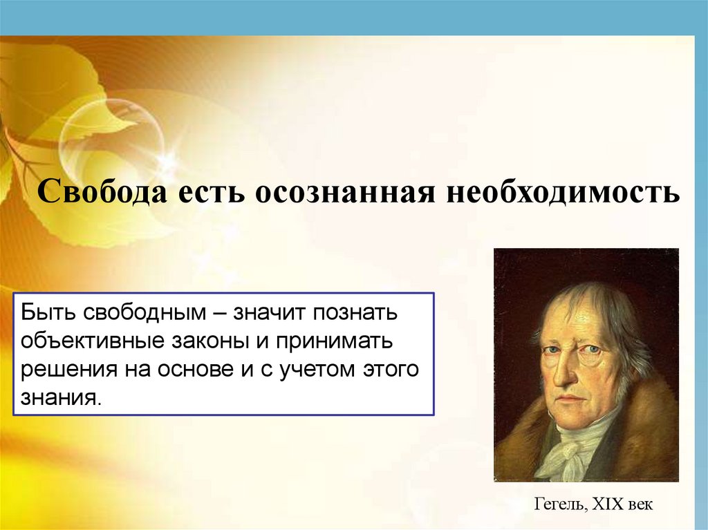 Свобода есть осознанная необходимостьБыть свободным – значит познать