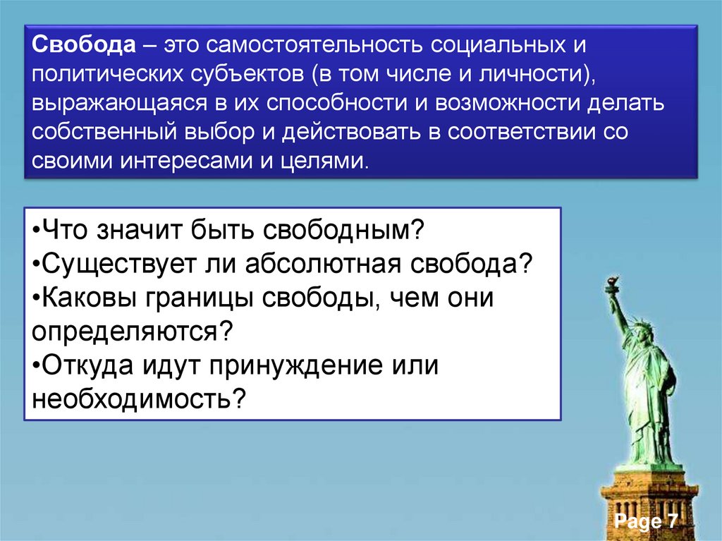 Свобода – это самостоятельность социальных иполитических субъектов (в том числе и личности),