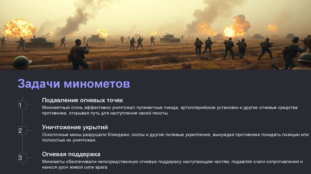 Минометный огонь эффективно уничтожал пулеметные гнезда, артиллерийские установки и другие огневые средства