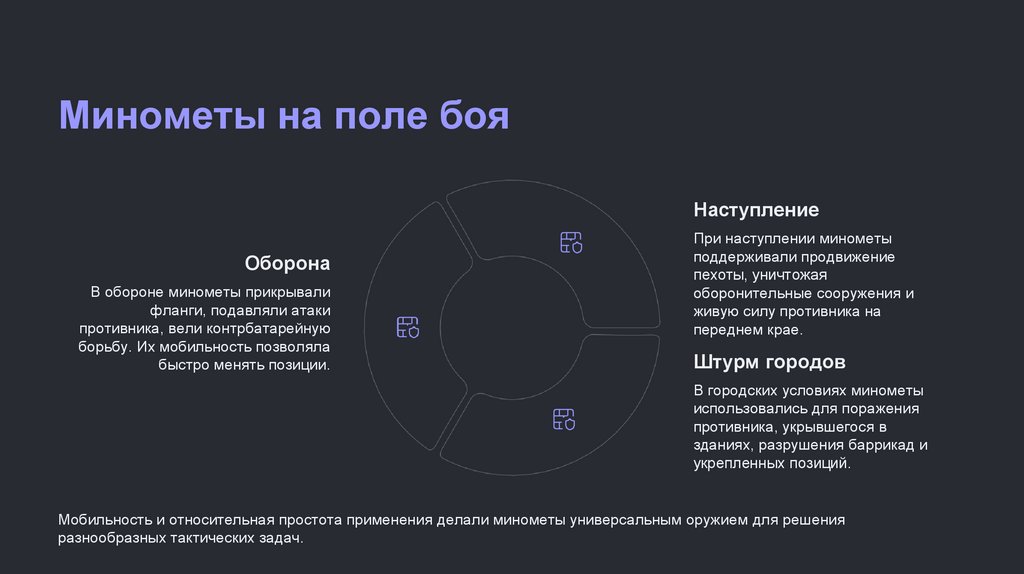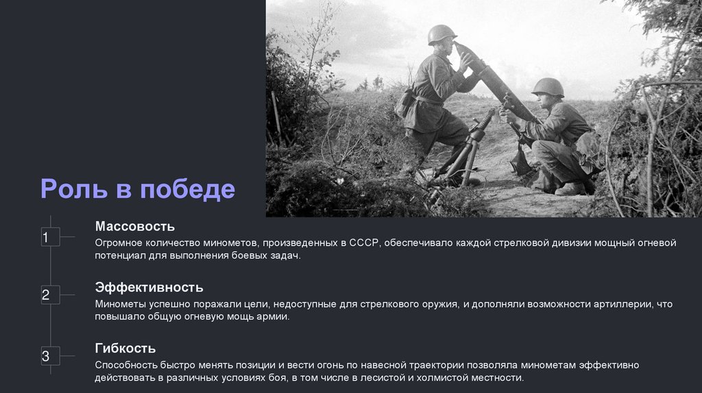 Способность быстро менять позиции и вести огонь по навесной траектории позволяла минометам эффективно