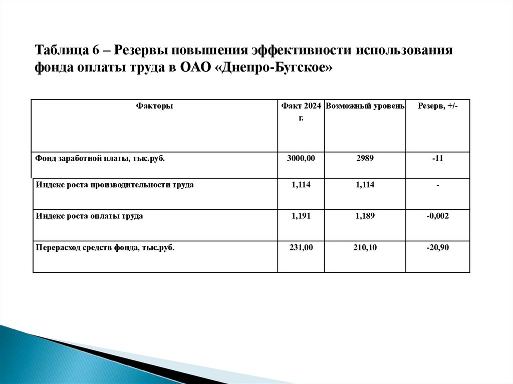 Таблица 6 – Резервы повышения эффективности использованияфонда оплаты труда в ОАО «Днепро-Бугское»