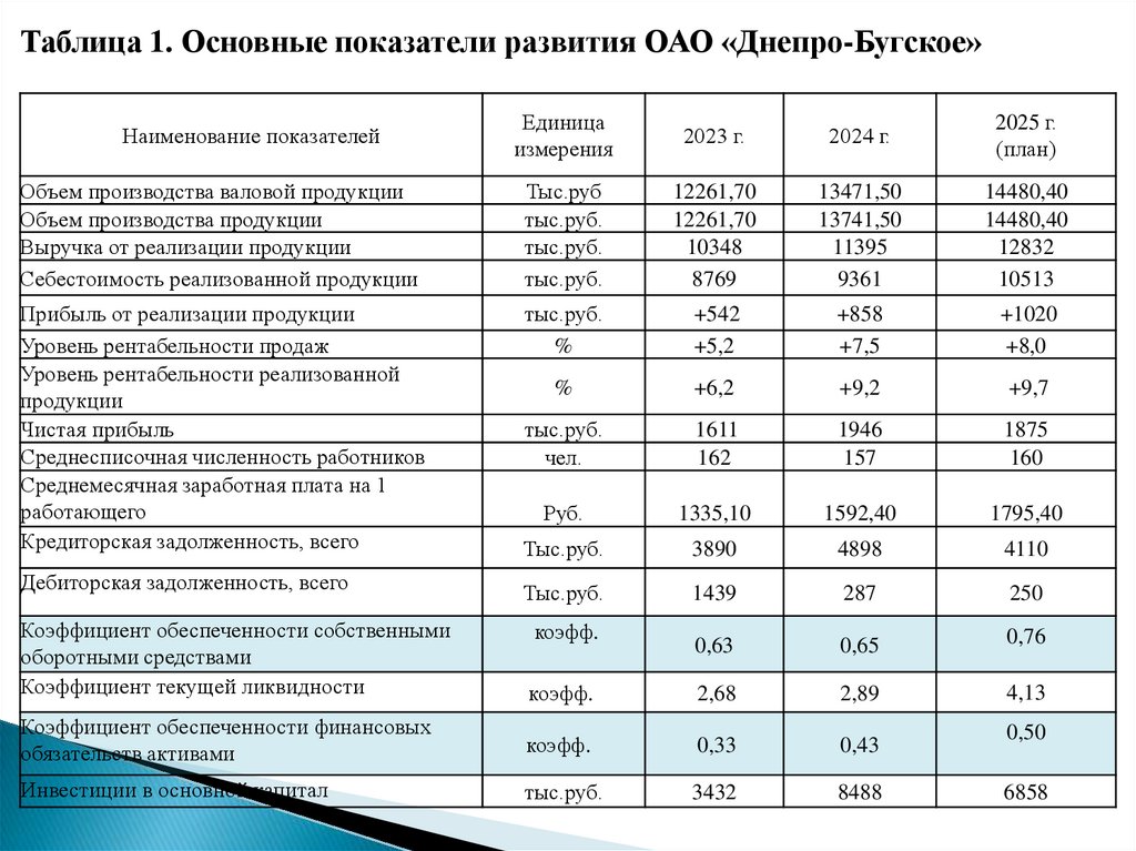 Таблица 1. Основные показатели развития ОАО «Днепро-Бугское»Единица
