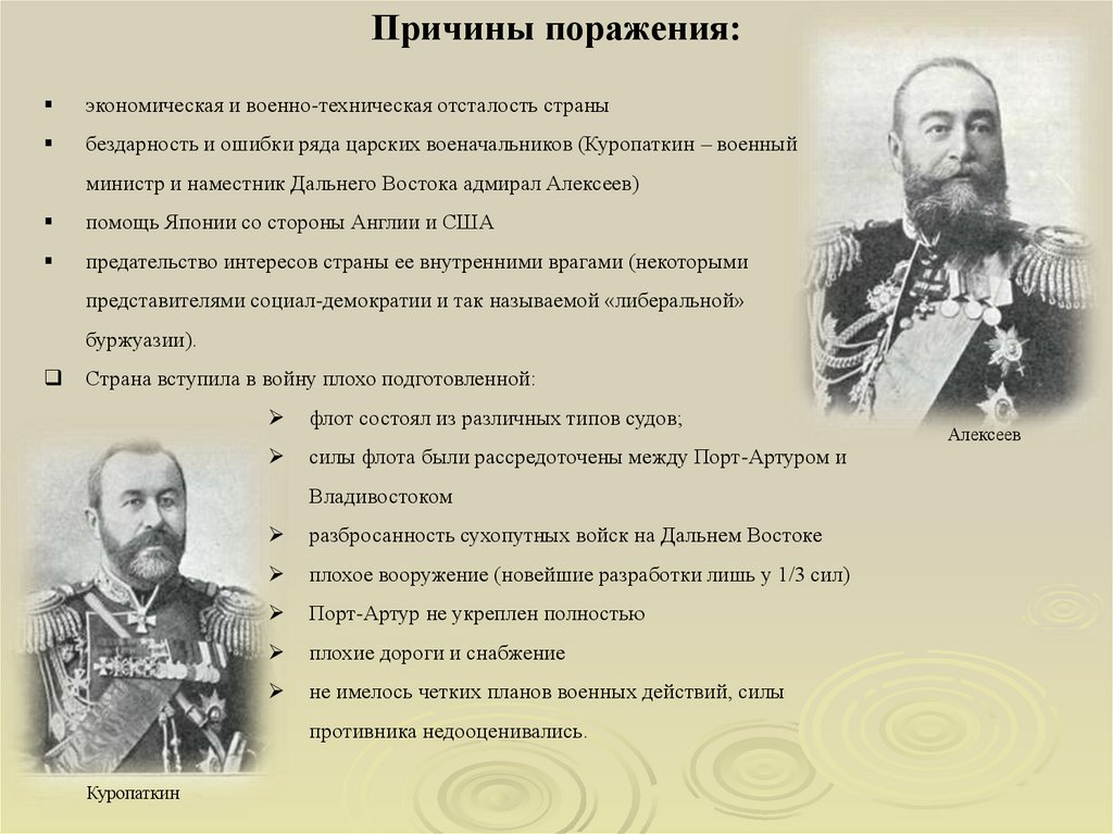 бездарность и ошибки ряда царских военачальников (Куропаткин – военный