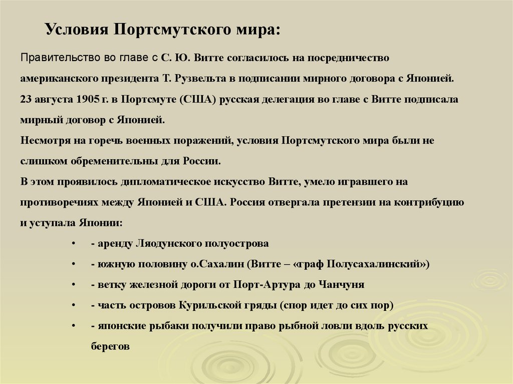 Условия Портсмутского мира:Правительство во главе с С. Ю. Витте согласилось на посредничество