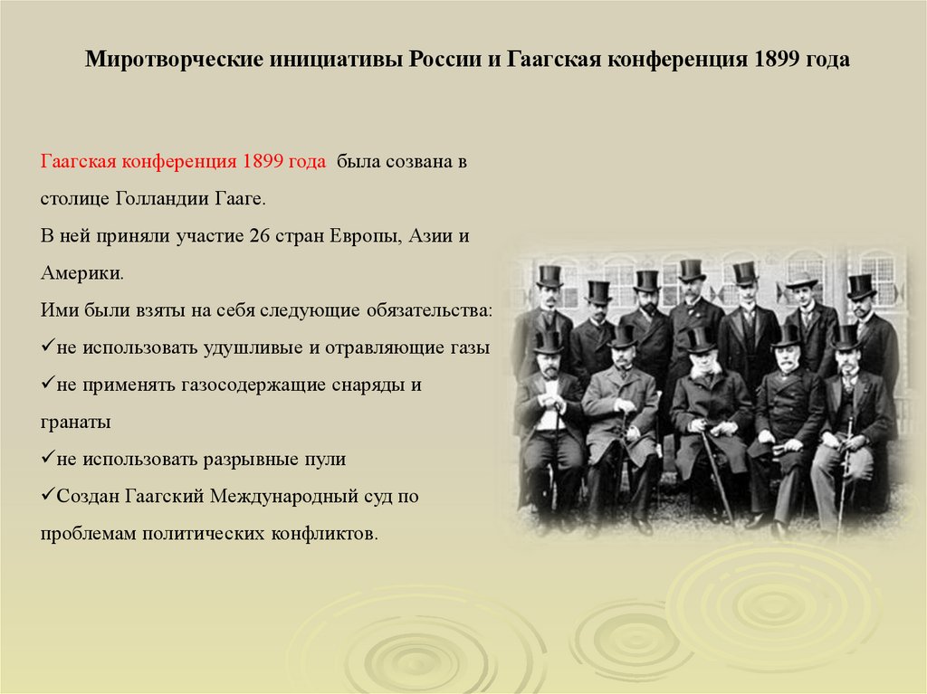 Миротворческие инициативы России и Гаагская конференция 1899 годаГаагская конференция 1899 года была созвана в