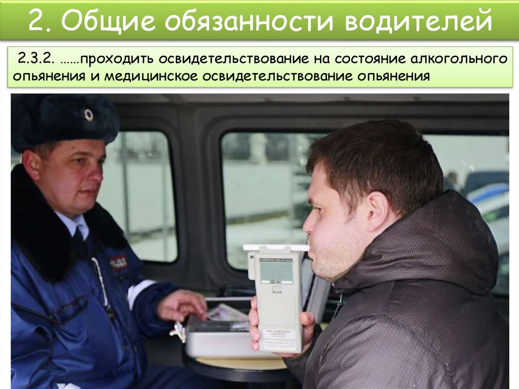 2. Общие обязанности водителей2.3.2. ……проходить освидетельствование на состояние алкогольного