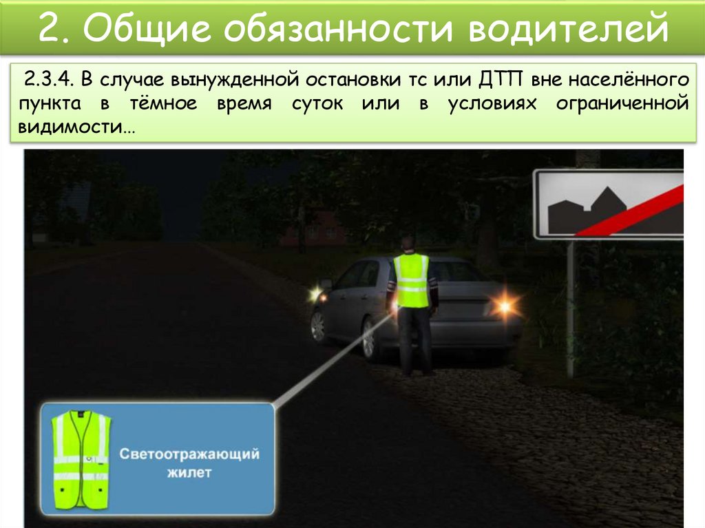 2. Общие обязанности водителей2.3.4. В случае вынужденной остановки тс или ДТП вне населённого