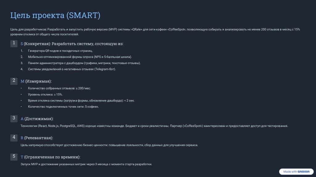 Цель проекта (SMART)Цель для разработчиков: Разработать и запустить рабочую версию (MVP) системы «QRate» для сети кофеен «CoffeeSpot», позволяющую собирать и анализировать не менее 200 отзывов в месяц с 15%