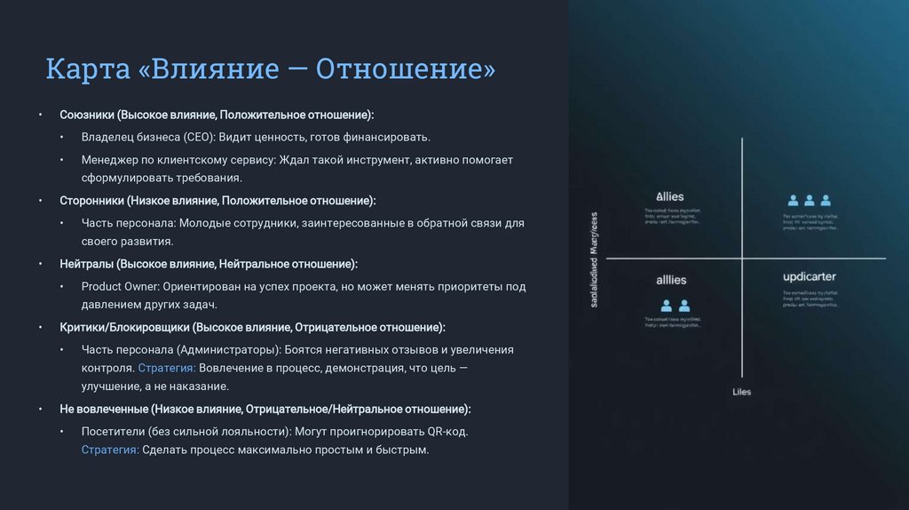 Карта «Влияние — Отношение»Союзники (Высокое влияние, Положительное отношение):