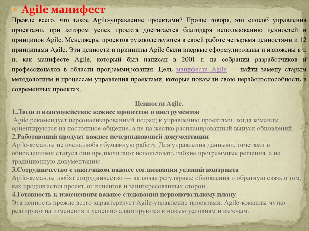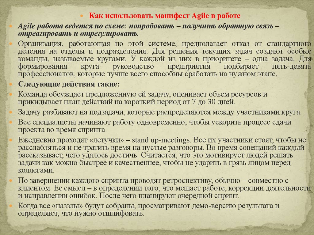 Как использовать манифест Agile в работеAgile работа ведется по схеме: попробовать – получить обратную связь –