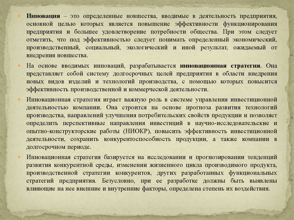 Инновация – это определенные новшества, вводимые в деятельность предприятия,основной целью которых является повышение эффективности функционирования