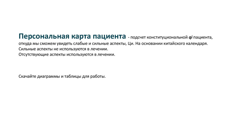 Персональная карта пациента - подсчет конституциональной qi пациента,откуда мы сможем увидеть слабые и сильные аспекты, Ци. На основании китайского календаря.