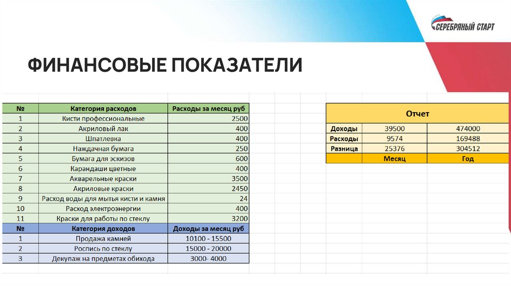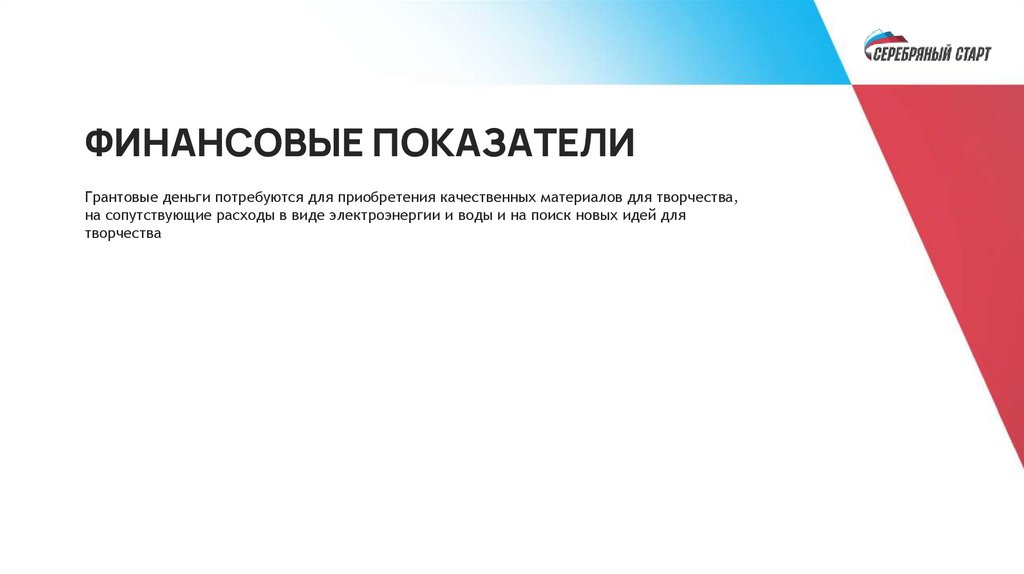 ФИНАНСОВЫЕ ПОКАЗАТЕЛИГрантовые деньги потребуются для приобретения качественных материалов для творчества,