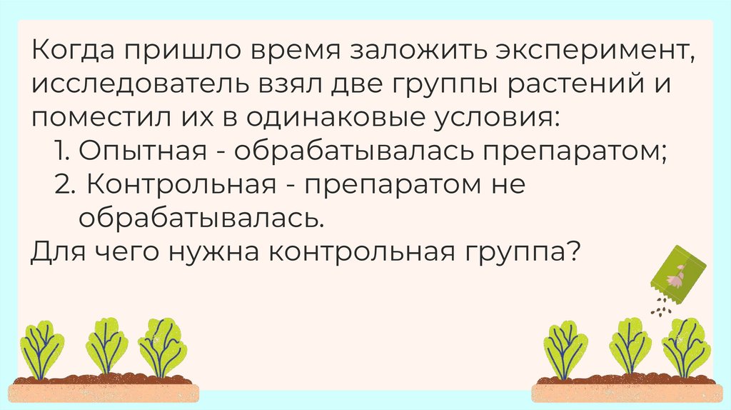 Когда пришло время заложить эксперимент,исследователь взял две группы растений и