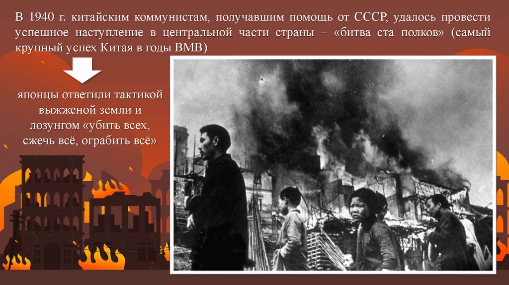 В 1940 г. китайским коммунистам, получавшим помощь от СССР, удалось провестиуспешное наступление в центральной части страны – «битва ста полков» (самый
