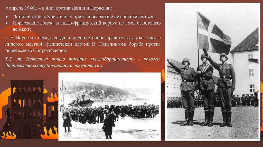 9 апреля 1940г. – война против Дании и Норвегии:Датский король Кристиан Х призвал население не сопротивляться;