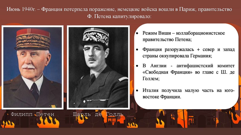 Июнь 1940г. – Франция потерпела поражение, немецкие войска вошли в Париж, правительствоФ. Петена капитулировало: