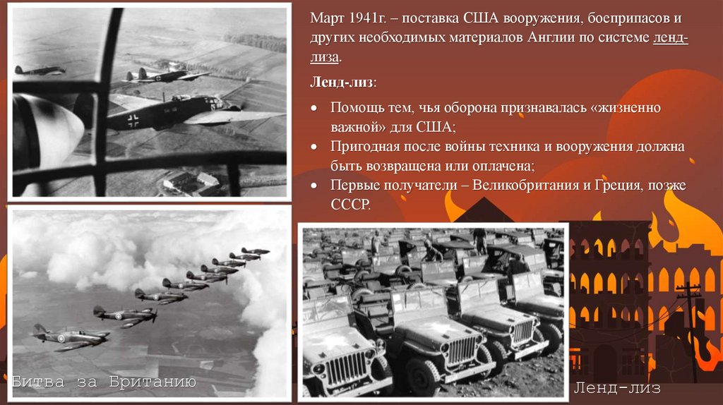 Март 1941г. – поставка США вооружения, боеприпасов идругих необходимых материалов Англии по системе лендлиза.