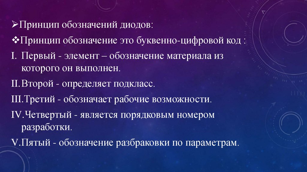Принцип обозначений диодов:Принцип обозначение это буквенно-цифровой код :